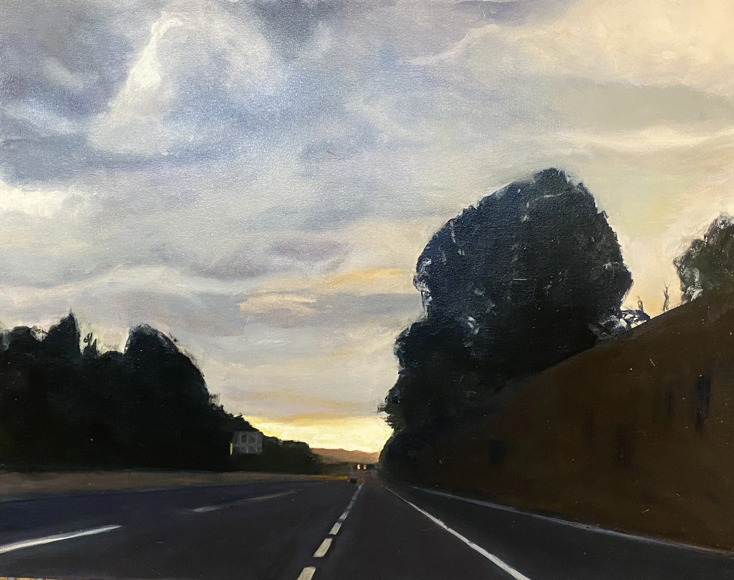 This was my view from the passenger seat on the autobahn in Bavaria, traveling to the airport and headed home. The sunset on the horizon drew us forward over the dark roadway. The large trees on either side were eerie and sheltering all at once. The clouds in the sky were a dream.